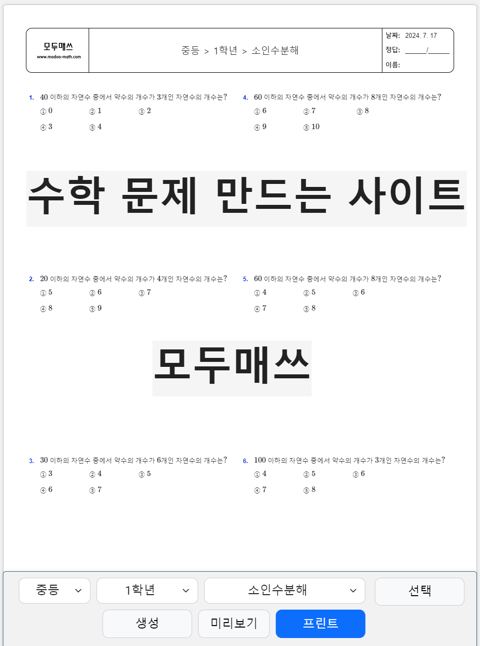 | 중등 1학년 수학 > 소인수분해 > 약수의 개수, 빈칸 넣기 연습문제 프린트 학습지 (0) | 2024.07.17 |