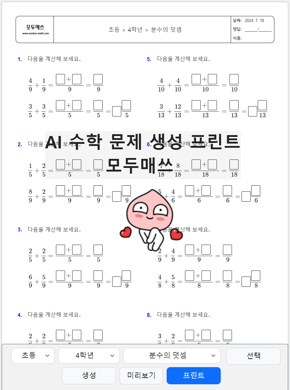 이미지를 클릭하게 되면 '모두매쓰' 사이트로 이동해서 자동으로 문제 생성이 될거에요.