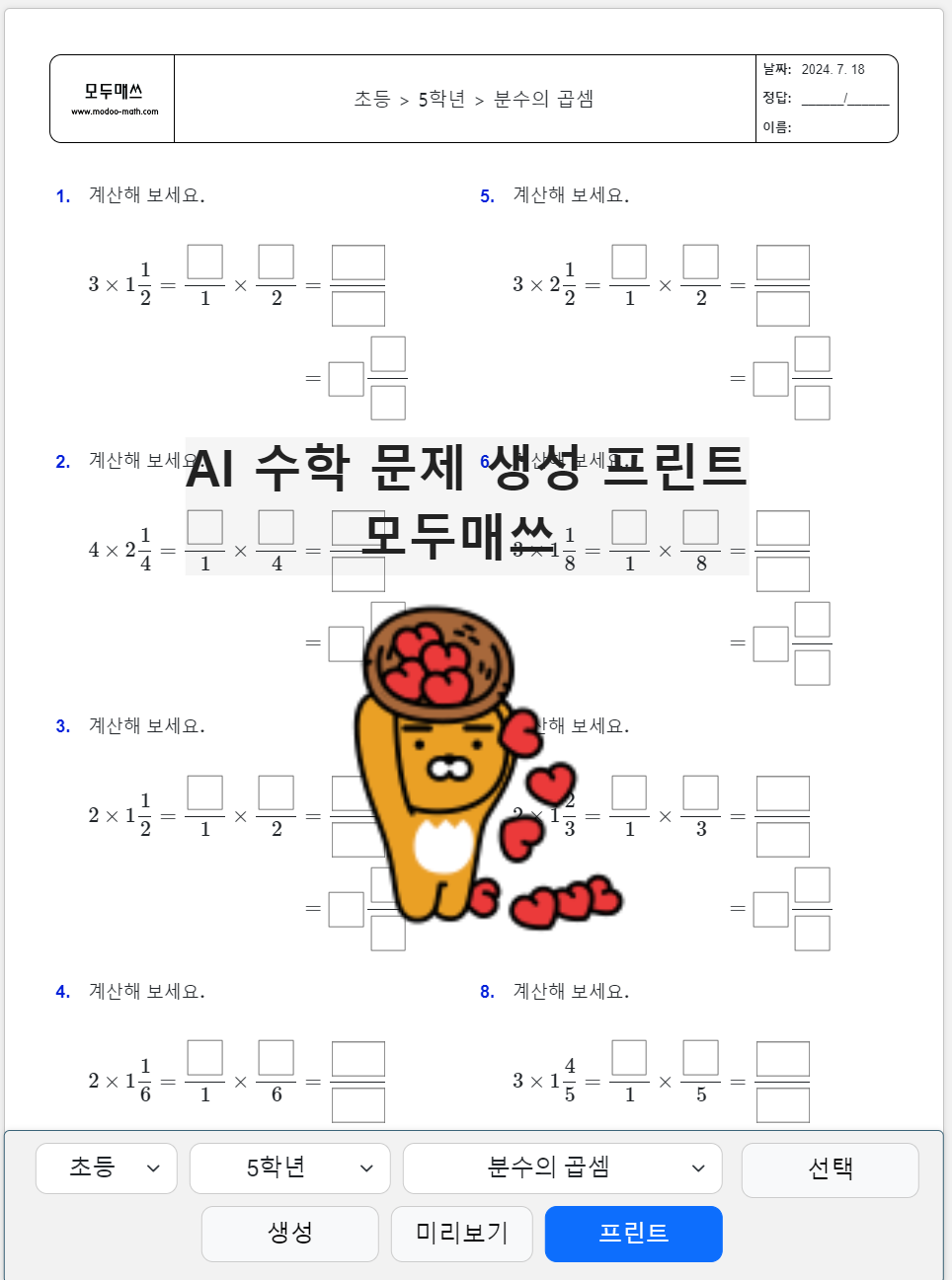 초등 5학년 수학 > 분수의 곱셈 > (자연수) × (대분수) 연습문제 프린트 학습지