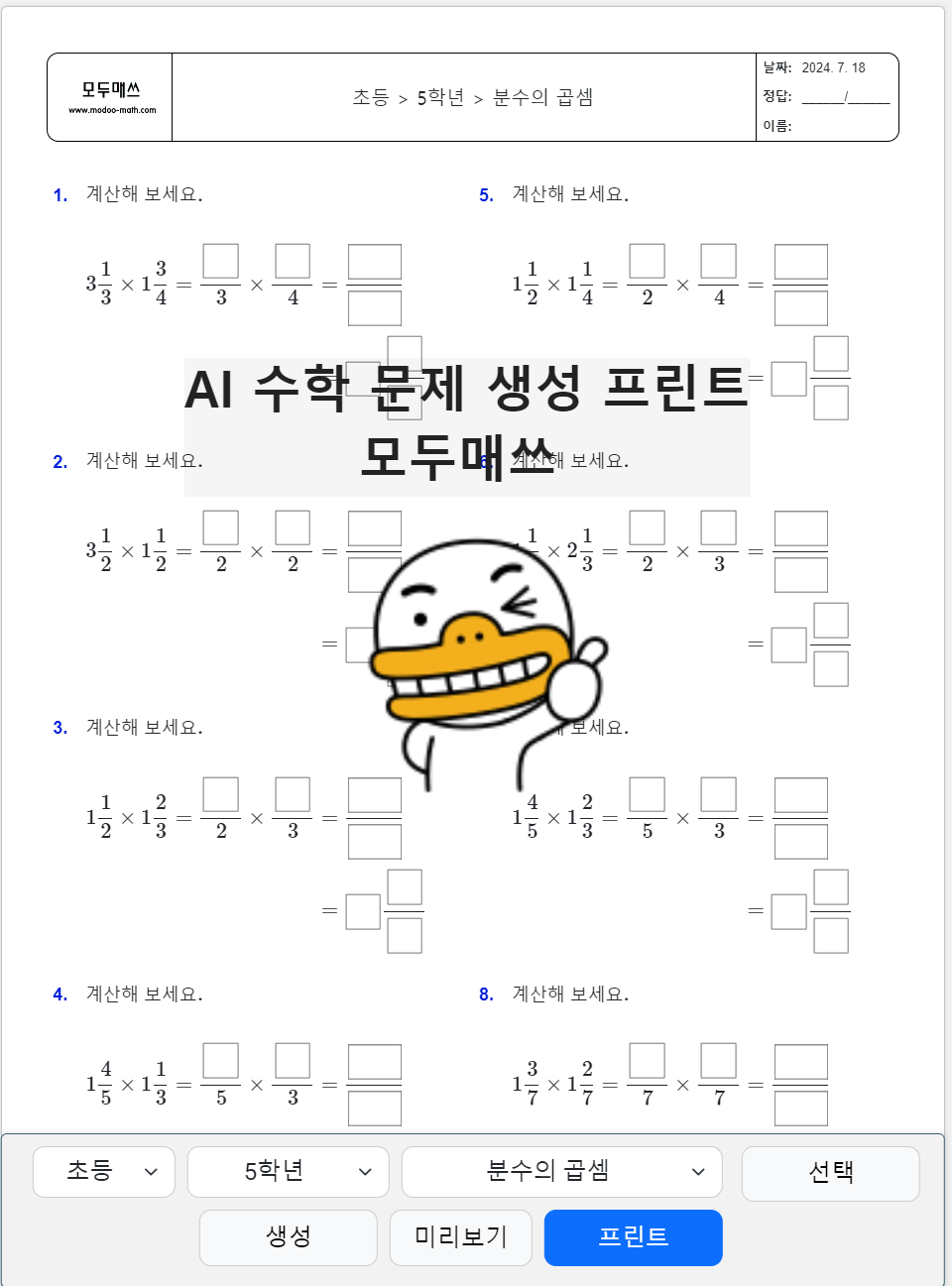 | 초등 5학년 수학 > 분수의 곱셈 > (자연수) × (대분수) 연습문제 프린트 학습지 (0) | 2024.07.18 |
