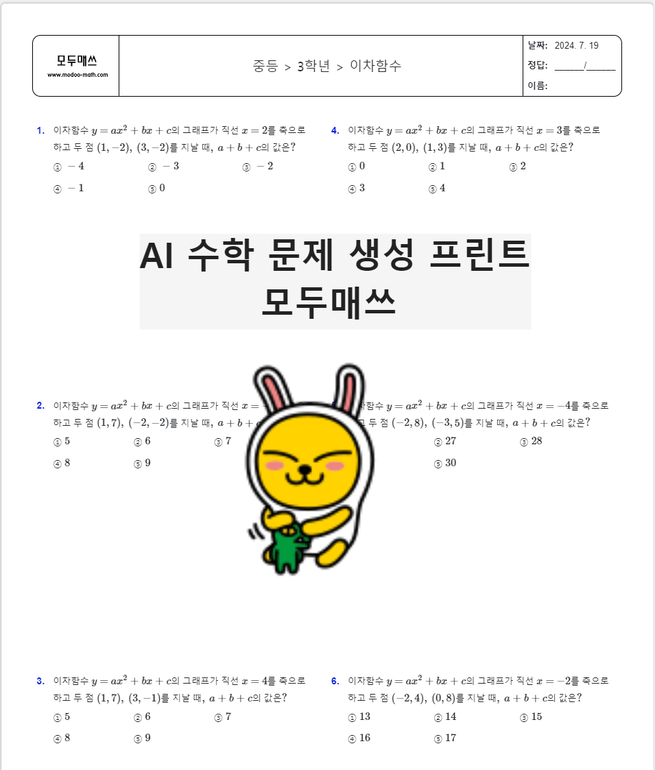 모두매쓰는 수학 문제 학습지를 무제한으로 생성하고 화면에서 즉시 풀 수 있도록 제공하는 인공지능 서비스입니다. 초등, 중등, 고등 교과서에서 다루는 핵심적인 문제들을 다양하게 제공하며