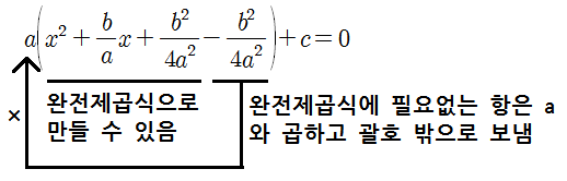 이때, 이차항 + 일차항 + 상수 라는 3개의 항이 완전제곱식으로 만들 수 있는 세트가 되고 -상수는 필요없기에 괄호 밖으로 빼줘야 한답니다. 주의할 점은 이때 괄호 앞에 있는 a와 곱해서 밖으로 보내야 한다는 거에요.
