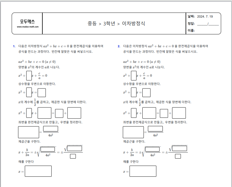 중등 3학년 수학 > 이차방정식 > 근의 공식 증명, 연습문제 프린트 학습지