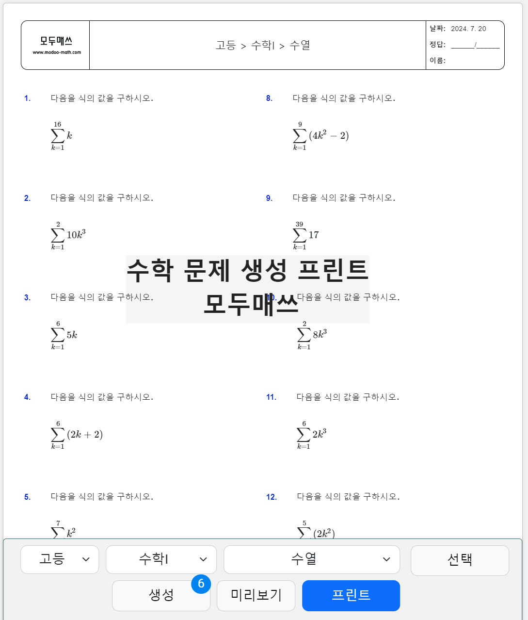 고등 수학I > 수열의 합 > 자연수의 거듭제곱의 합 공식, 연습문제 프린트 학습지