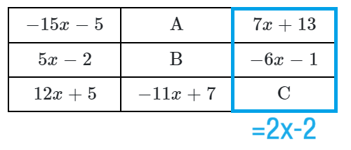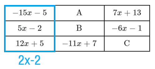 일차식의 합이 $2x-2$라는 것을 찾았고, 이를 통해 $A, B, C$에 들어갈 일차식을 계산하면,