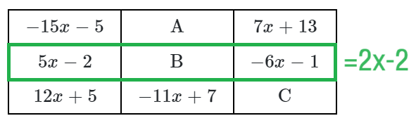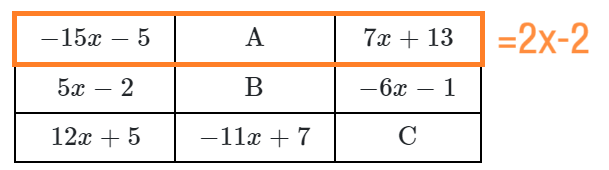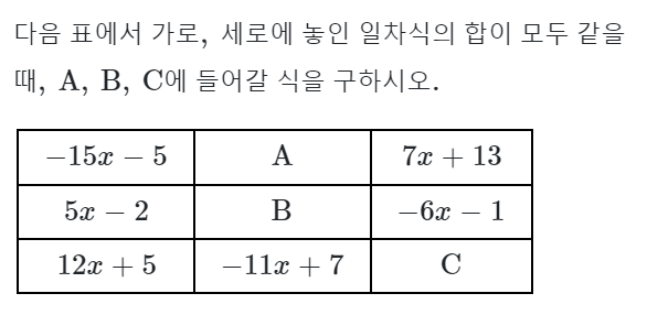 가로와 세로에 일차식의 합이 모두 같은 다음과 같은 표가 있는 문제 유형입니다.
