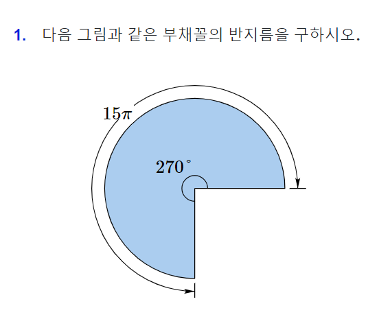 중등 1학년 수학 > 원과 부채꼴 > 부채꼴의 반지름의 길이 구하기 연습문제 프린트 학습지