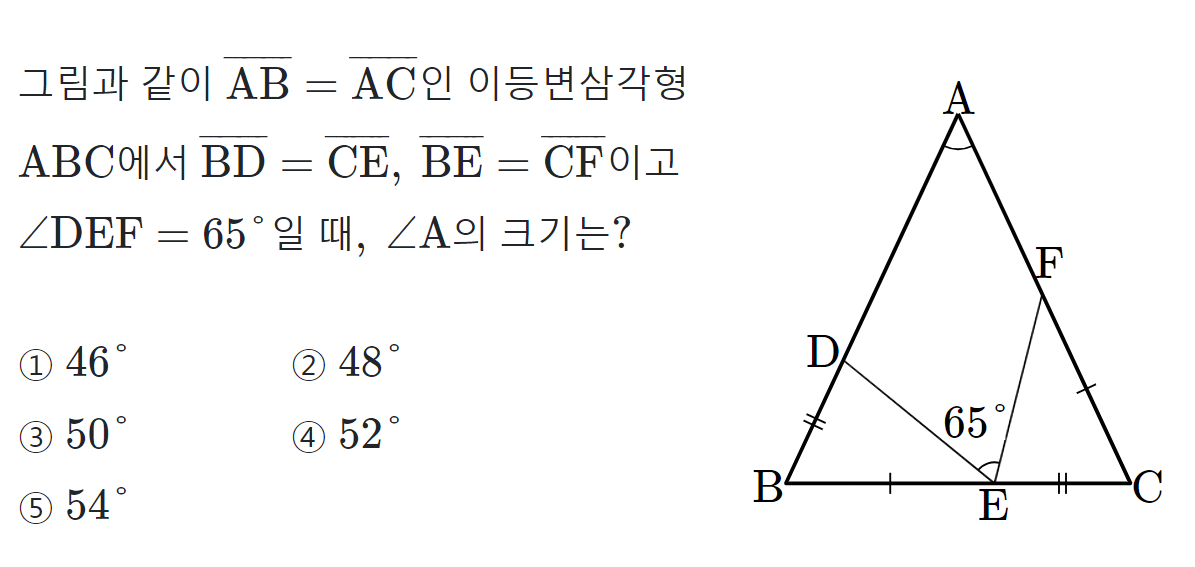 문제에서 주어진 정보는 이등변삼각형 \( \overline{AB} = \overline{AC} \)에서, 각 \( \angle DEF \)가 주어지고, 이를 바탕으로 삼각형의 다른 각을 구하는 것입니다.