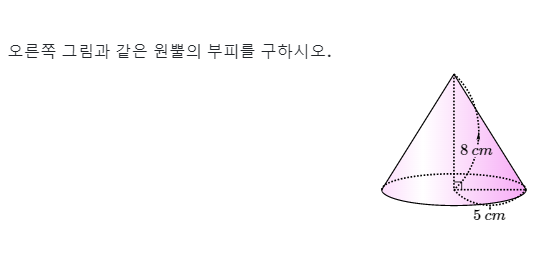 \[\text{원뿔의 부피} = \dfrac{1}{3} \times \pi \times 5^2 \times 8 = \dfrac{1}{3} \times \pi \times 25 \times 8 = \dfrac{1}{3} \times \pi \times 200 = 75\pi \, \text{cm}^3\]