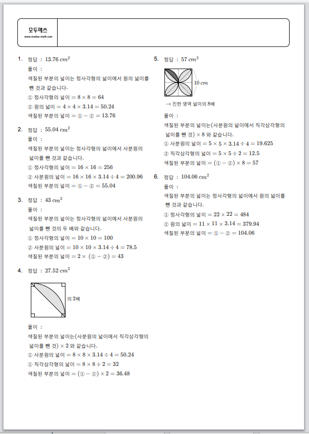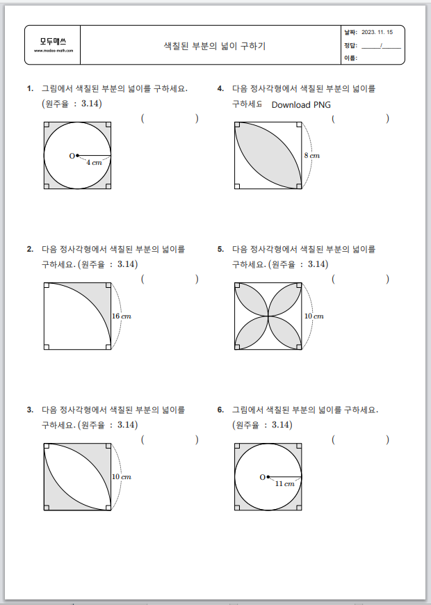 초등 6학년 > 평면도형 > 색칠된 원의 넓이 구하기 연습문제 프린트 학습지