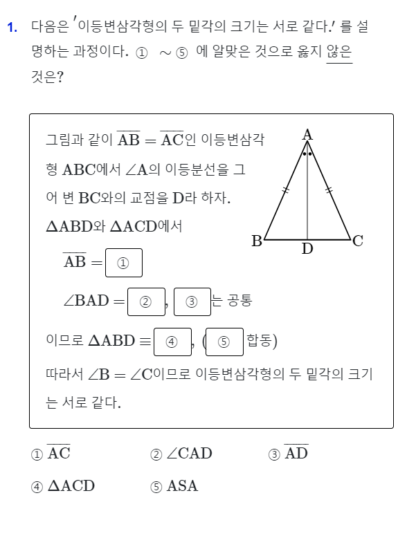 1번 보기에 들어가는 것은 선분AC인데요, 문제에서 처음에 이등변삼각형이라는 조건이 주어졌기 때문에 말할 수 있는 조건입니다.