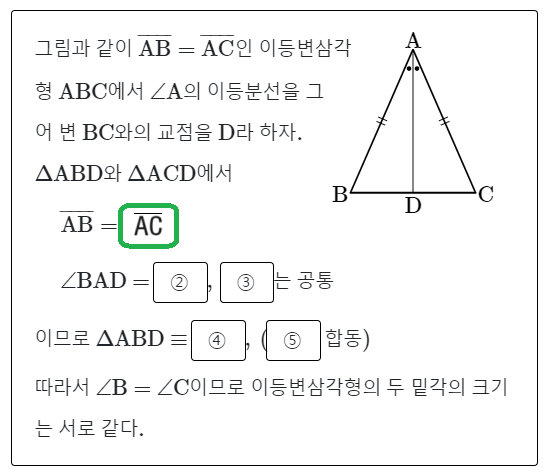 이 문제는 이등변삼각형의 성질인 '이등변삼각형의 두 밑각의 크기는 서로 같다'는 것을 증명하는 문제예요.