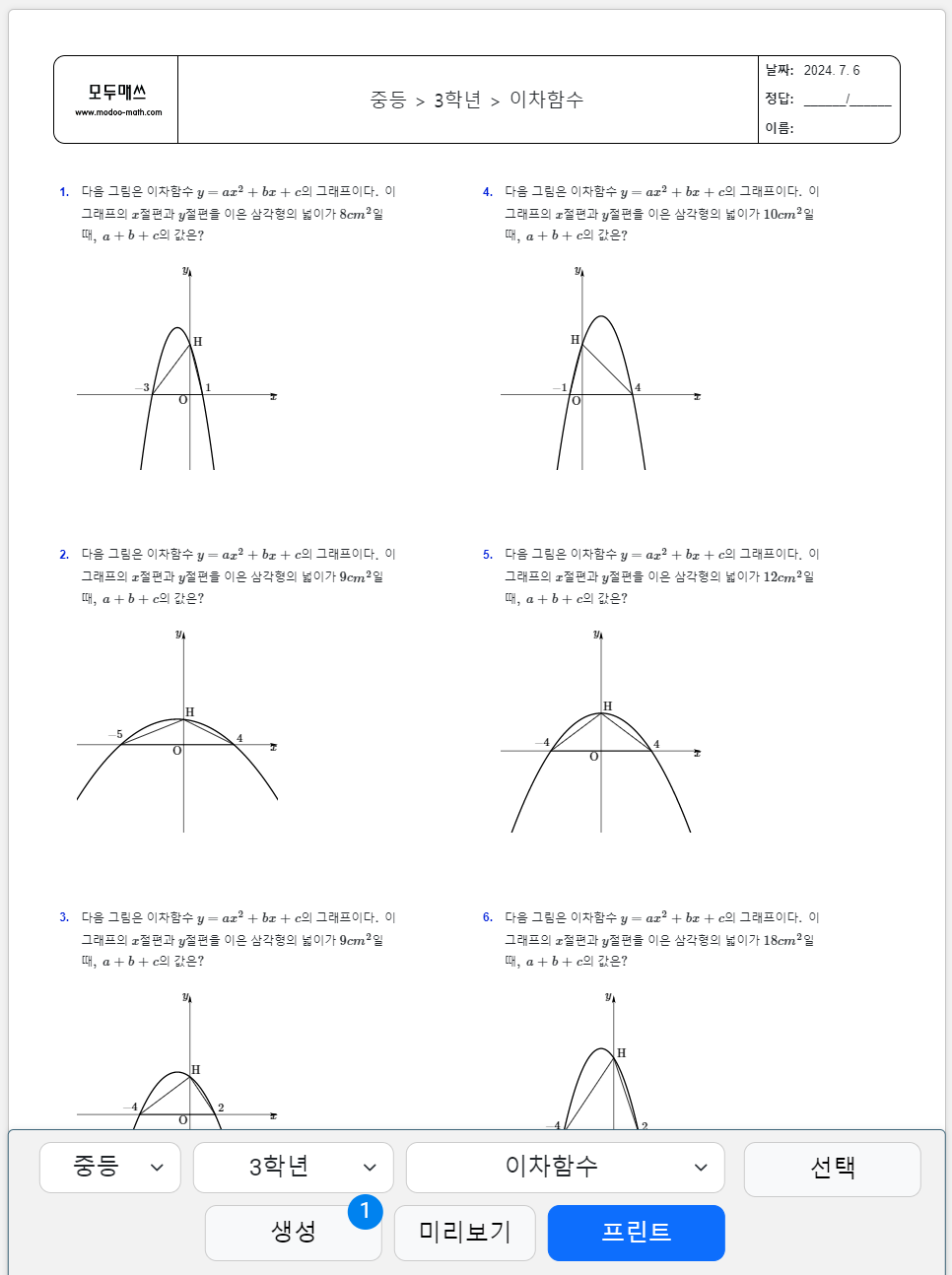 다음은 이차함수의 문제를 무제한으로 생성하여 프린트할 수 있는 '모두매쓰'라는 사이트 링크입니다.