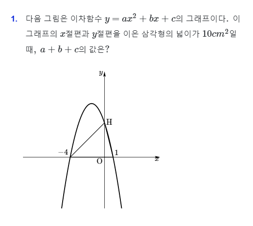 여기에서 미지수 $a$는 그래프의 모양에 대한 정보를 담고 있지만 아직까지는 정확한 값을 모르는 상태예요. 그래프에서 또 다른 정보를 찾아서 식에 적용해야해요. 문제에서는 삼각형의 넓이가 $10cm^2$라고 하므로 점H의 $y$좌표가 $4$라는 것을 알 수 있어요. 즉 $(0,4)$를 이차함수의 그래프가 지나고 있어요. 값을 대입하면 성립하므로