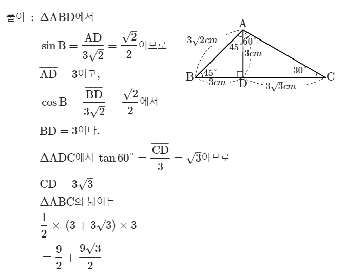 삼각형의 넓이를 구하는 문제 중, 높이를 삼각비를 통해 구해야하는 문제가 있어요.