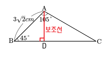 꼭짓점 A에서 마주보는 변 BC에 수선의 발을 긋게 되면 2개의 직각삼각형이 만들어집니다. 보통 이런 문제는 각각의 삼각형의 내각이 삼각비의 값을 알고 있는 '특수각'입니다. 이를 바탕으로 풀이를 하면 다음과 같아요.