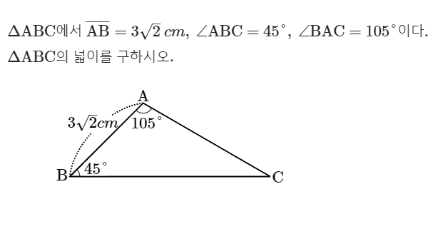 위 삼각형의 넓이를 구하기 위해서는 '밑변'과 '높이'를 알아야 하는데요, 두 값 모두 위 도형에서는 표시가 되어 있지 않았는데요, 대신 삼각형의 내각의 크기와 한 변의 길이가 주어져있습니다. 이때, 적절하게 보조선을 긋게 되면 문제를 해결할 수가 있어요.