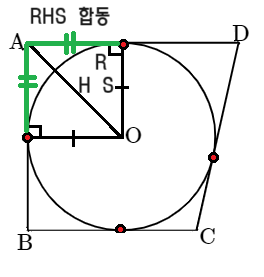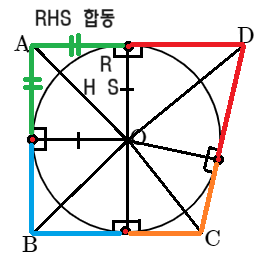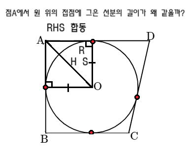 점A에서 원의 중심을 연결하고 원의 중심에서 접점을 연결하면 2개의 직각삼각형이 만들어지는데요, 두 직각삼각형은 RHS(직각,빗변,한변의 길이) 합동이기 때문에 각 꼭짓점에서 접점에 그은 선분의 길이가 같은 이유예요.