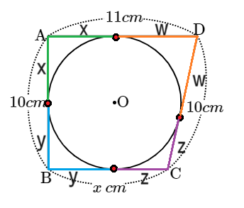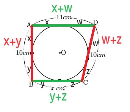 사각형의 각 꼭짓점에서 원 위의 접점까지의 거리가 모두 같은데요, 각각의 길이를 $x, y, z, w$라고 표현하면 위와 같은데요,