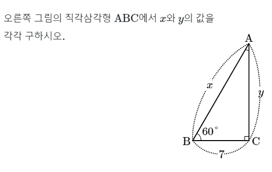 $cosB=cos60˚= \dfrac{\overline{BC}}{\overline{AB}} = \dfrac{7}{x}=\dfrac{1}{2}$