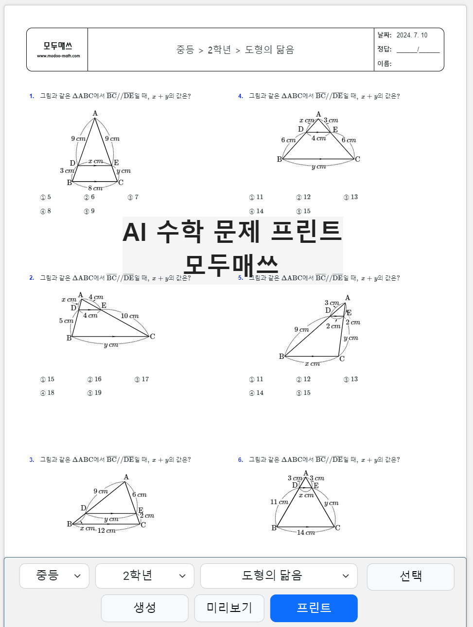 중등 2학년 수학 > 도형의 닮음 > 삼각형의 닮음 조건 개념, 연습문제 프린트 학습지