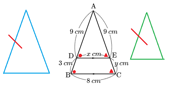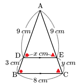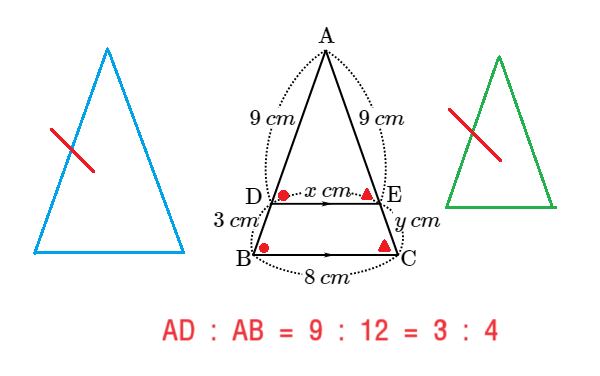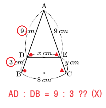 단순히 $9:3$이라고 닮음비를 말해서는 안된답니다. 왜 그럴까요? 그 이유는 삼각형ADE와 삼각형ABC가 닮음 삼각형인데, 삼각형ADE의 한 변 AD에 대응되는 삼각형ABC의 변이 DB가 아니기 때문이예요.