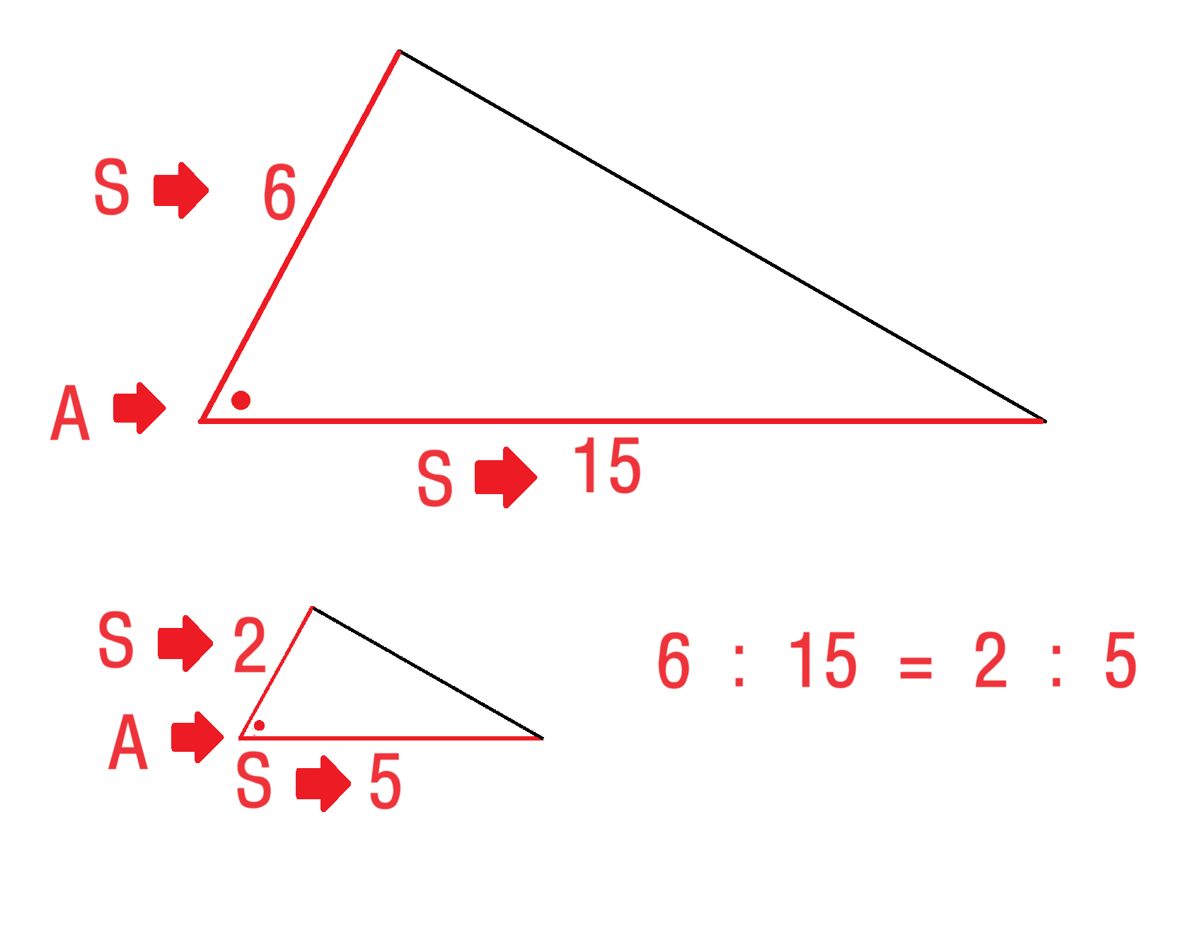 . 두 변의 길이의 비율이 같고, 그 끼인각의 크기가 같으면 두 도형은 SAS닮음입니다. 위 그림과 같이 6 : 15와 2 : 5는 비율이 같아요. 그리고 끼인각의 크기가 같아요. 주의할 점은 끼인각이 같아야 한다는 점입니다. 그렇지 않은 각의 크기가 같으면 닮음이 아닙니다.