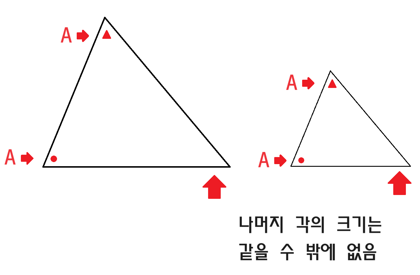 보통 A는 Angle(각)의 줄임말이예요. AA는 두 각의 크기가 같은 조건을 뜻해요. 두 각의 크기가 같으면 왜 닮음일까요?
