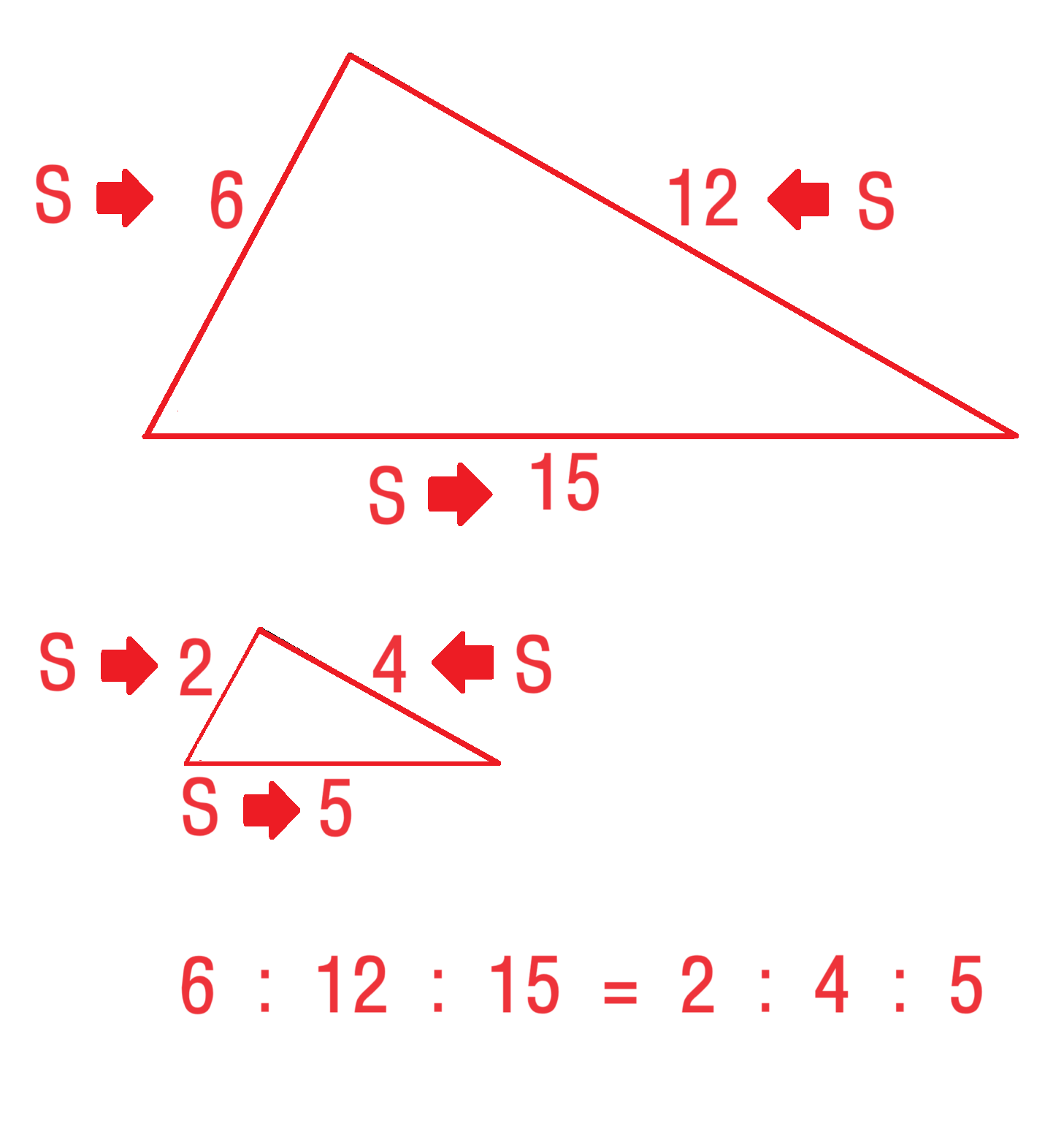 세 변의 길이가 모두 같은 SSS합동 조건과 비슷하죠? 하지만 이것도 마찬가지로 완전히 같은 변의 크기가 아닌 비율이 같은 변이 3개가 모여야 SSS닮음이라고 할 수 있어요.