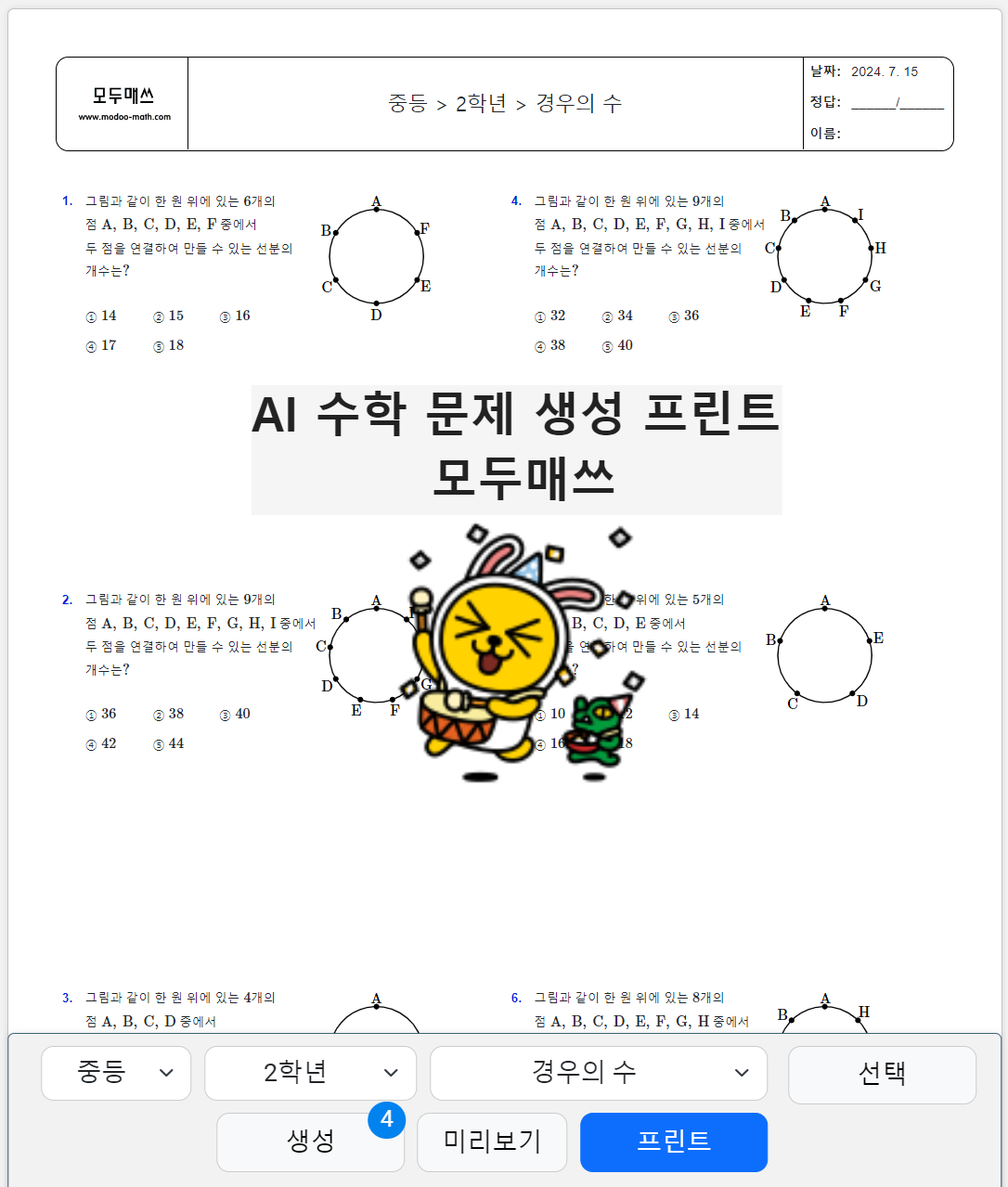 | 중등 2학년 수학 > 경우의 수 > 자격이 다른 대표 뽑는 경우의 수와 자격이 같은 대표 뽑는 경우의 수 연습문제 프린트 학습지 (0) | 2024.07.15 |