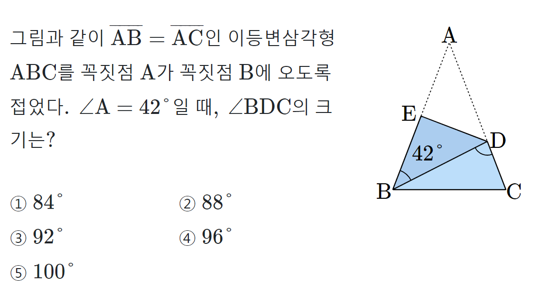 문제에서 주어진 정보는 이등변삼각형 \( \overline{AB} = \overline{AC} \)에서 꼭짓점 A가 꼭짓점 B에 접히면서 만들어진 도형입니다. 각 \( \angle A = 42^\circ \)이고, 이를 바탕으로 삼각형의 다른 각도를 구하는 것이 목표입니다.