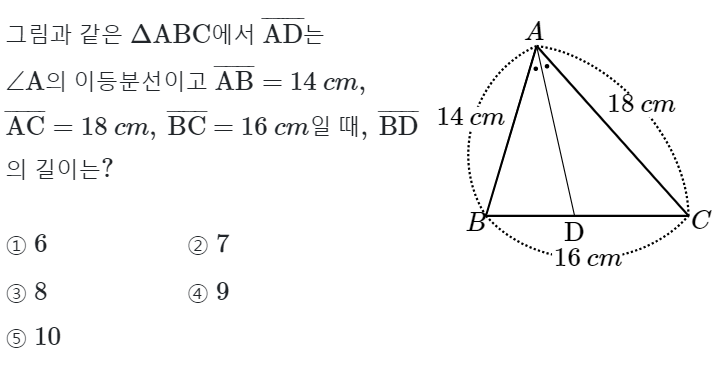 꼭지점A의 각의 이등분선이 선분BC와 만나는 점을 D라고 할 때,