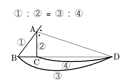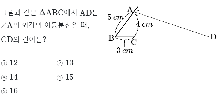 위 그림에서 각A의 외각의 이등분과 선분BC의 연장선이 만나는 점을 D라고 할 때, 다음과 같은 닮음비가 성립합니다.