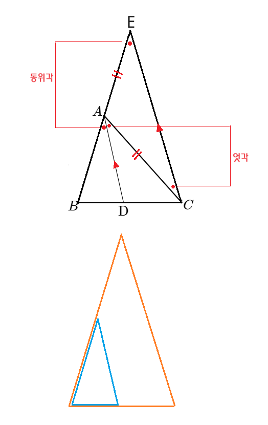닮음 조건 : $\overline{AD}//\overline{CE}$이므로 $\angle{BAD}=\angle{BEC}$이고 $\angle{BDA}=\angle{BCE}$이다. AA닮음)