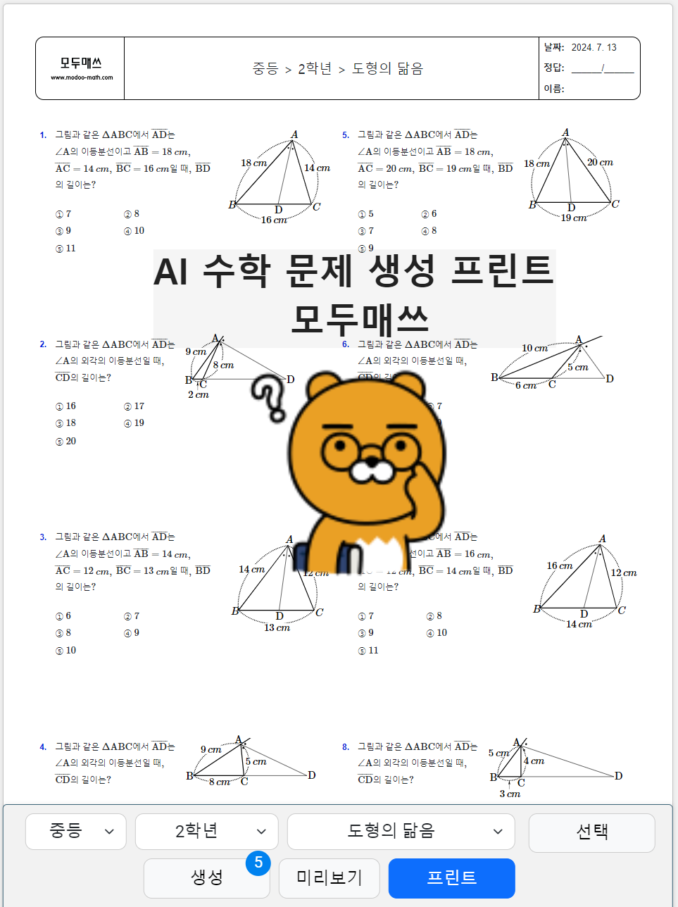 중등 2학년 수학 > 도형의 닮음 > 각의 이등분선과 닮음 증명, 연습문제 프린트 학습지