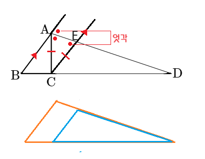 $\overline{AB}$의 위쪽 방향으로 연장선을 긋고, 점C를 지나고 $\overline{AD}$와 평행선을 그었을 때 만나는 점을 E라 하면 위와 같은 도형이 만들어지는데요,